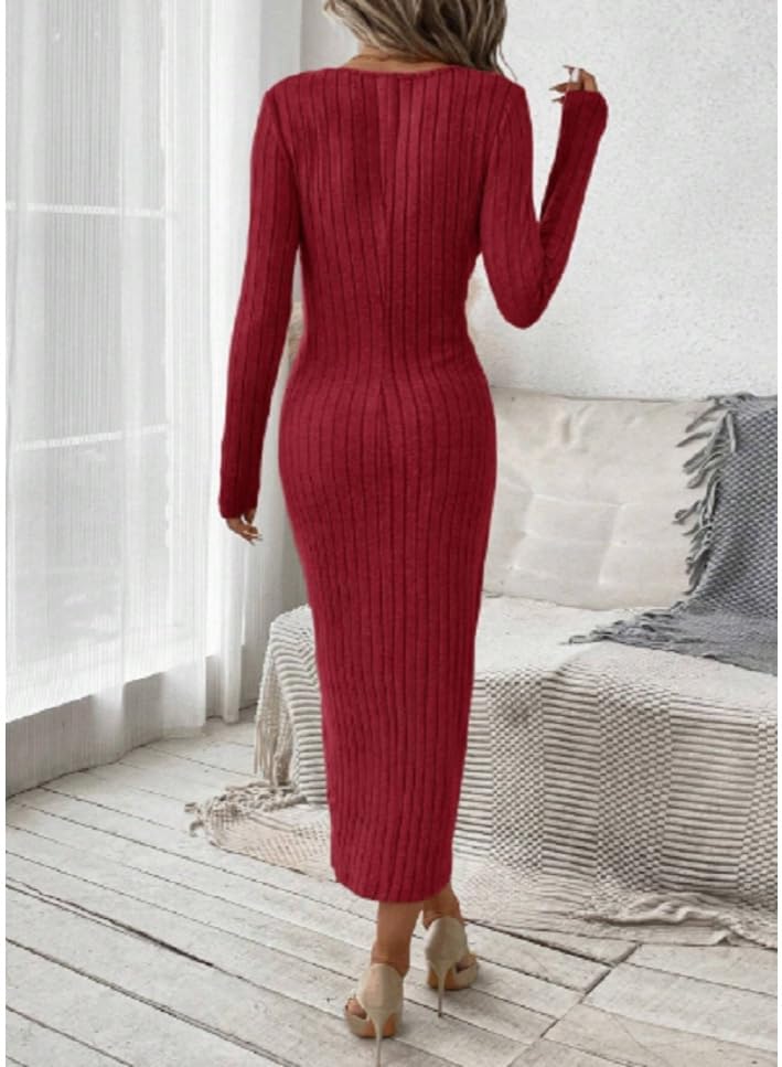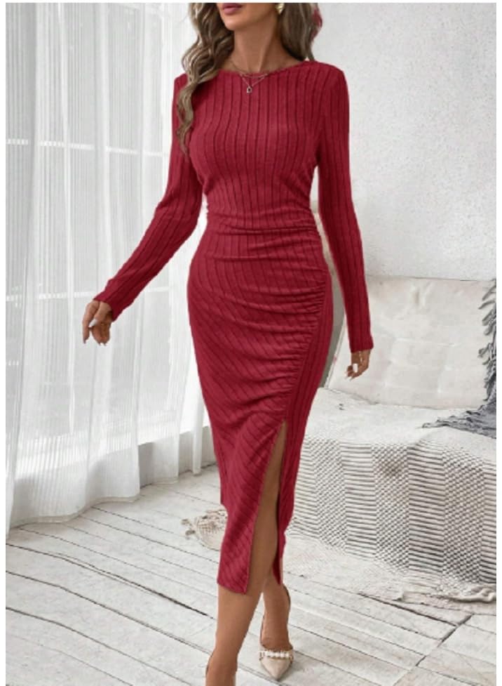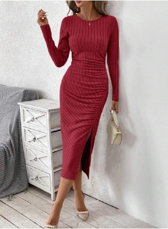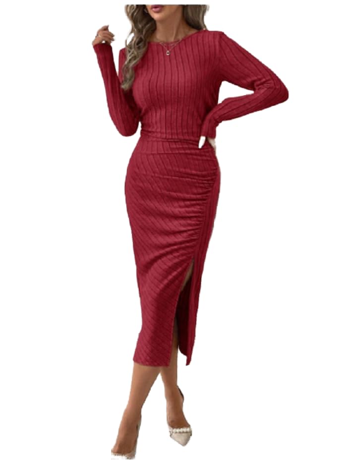 Generic - بلوزة باكمام طويلة وقبة دائرية وطيات مضلعة ومنقسمة على الفخذ للنساء بلون سادة