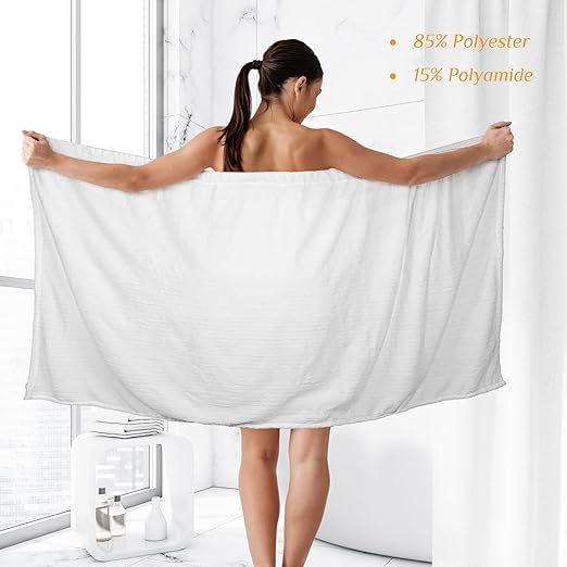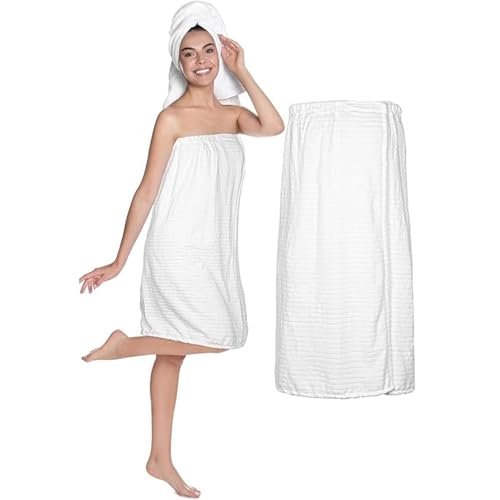 White Classic - منشفة سبا ملفوفة للنساء، روب حمام مخطط خفيف الوزن مع اغلاق قابل للتعديل وجزء علوي مطاطي، مقاس واحد (ابيض، مقاس واحد، لون سادة)