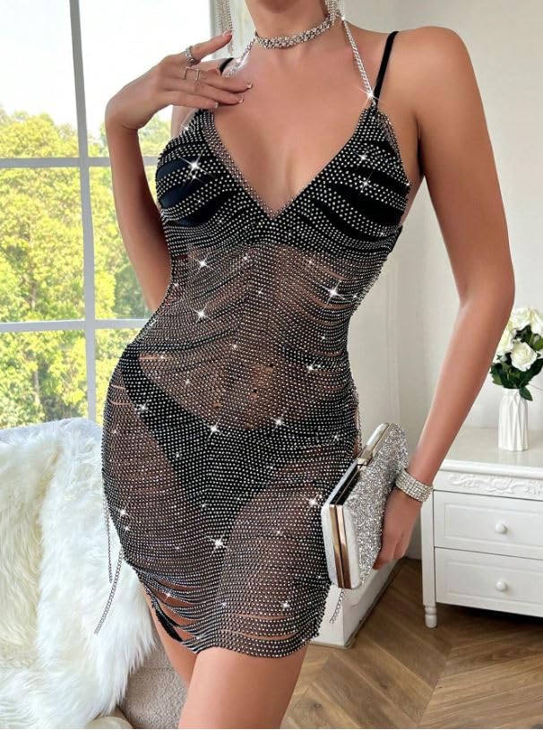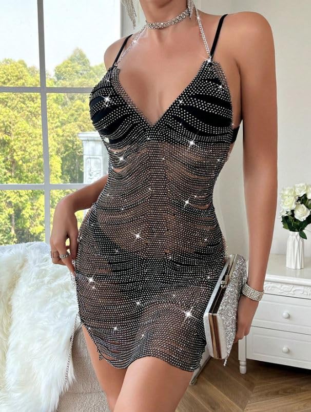 Generic - فستان قصير برقبة لامعة للنساء، حزام سباغيتي برقبة على شكل حرف V، اسود وفضي