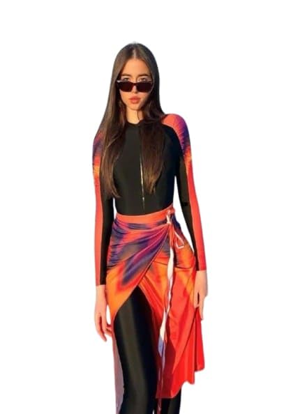 Generic - طقم رياضي نسائي، بدلة ضيقة بأكمام طويلة مع تنورة ملفوفة، تصميم عصري بألوان متعددة أسود وبرتقالي