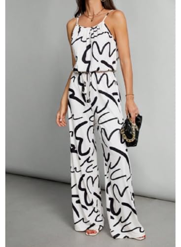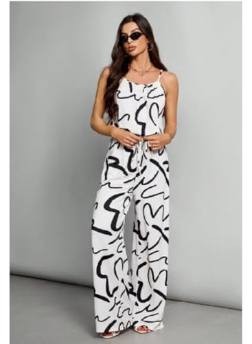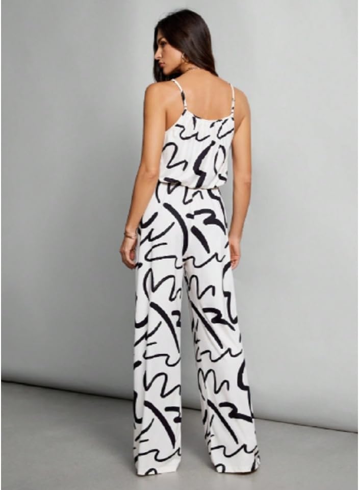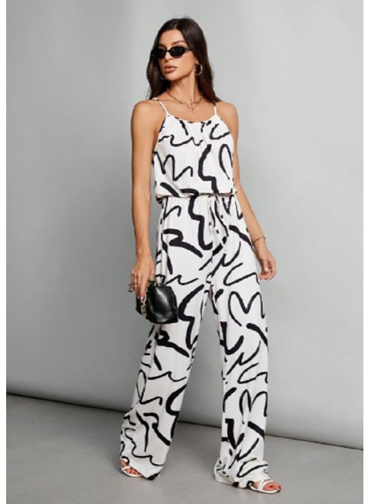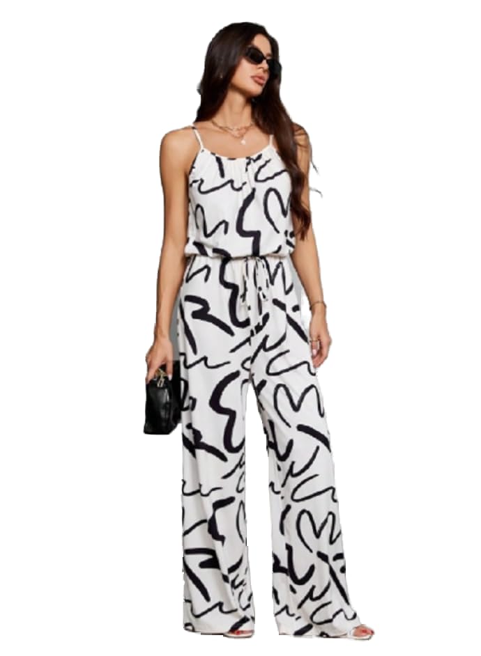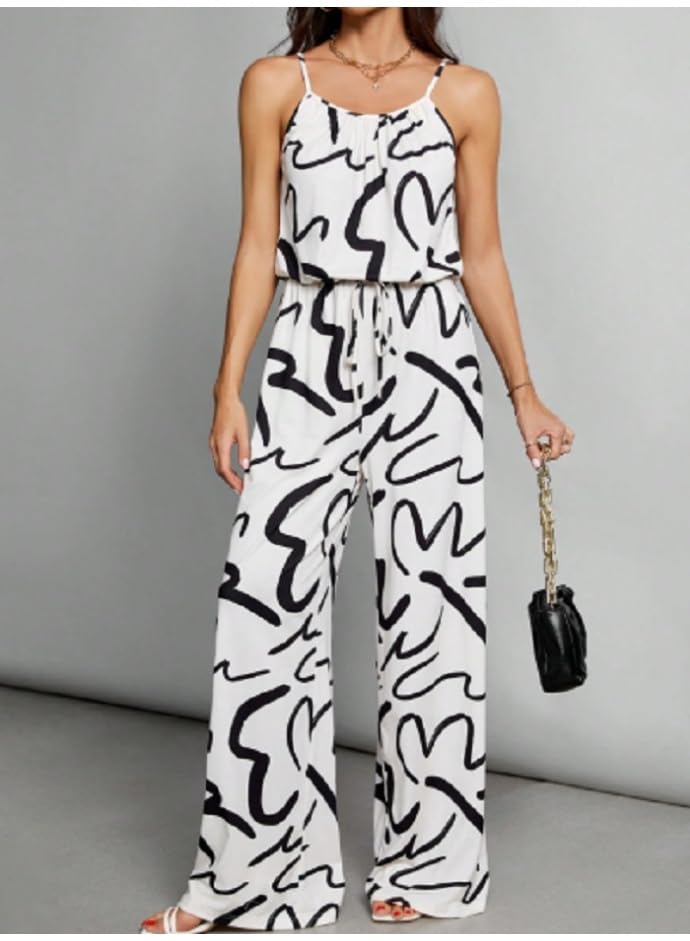 Generic - جمبسوت طويل كاجوال بحزام بحمالة وارجل واسعة مع افرهول مطبوع عليه حروف بالكامل - C