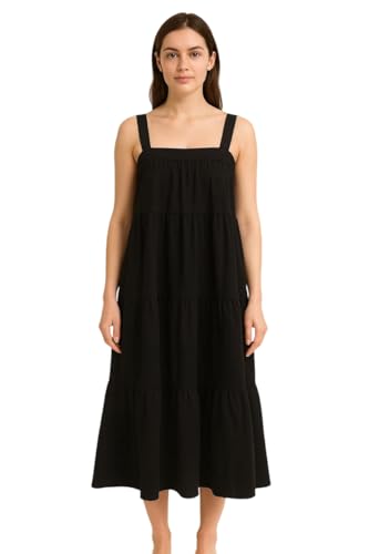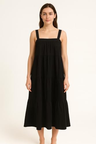 Generic - فستان ماكسي متعدد الطبقات للنساء، قطن اسود، حزام سباغيتي، فستان صيفي كاجوال صيفي بتصميم ايه لاين
