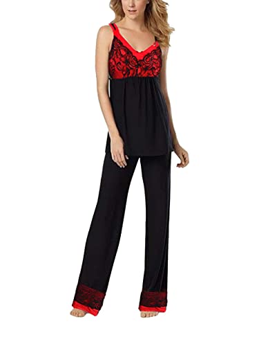 Generic - بيجامة نسائى توب بحمالات وبنطال مزينة بدانتيل لون أحمر