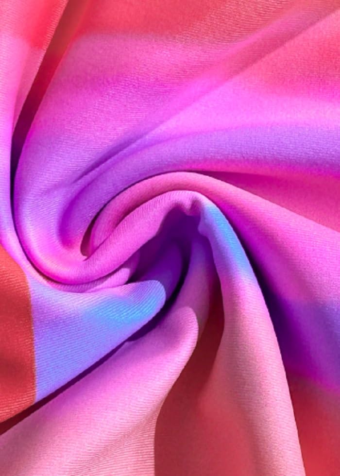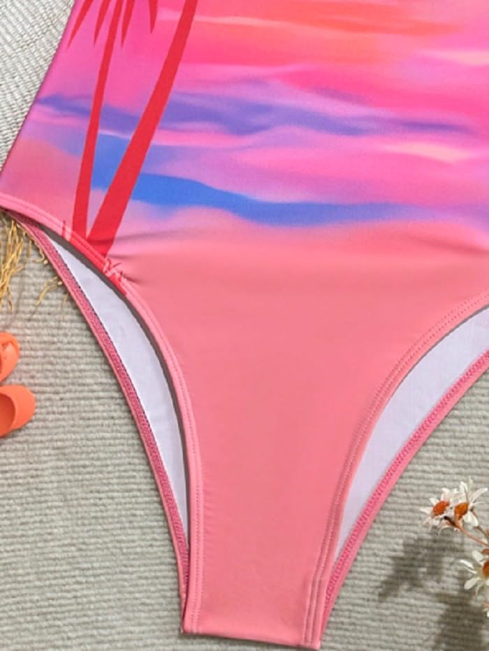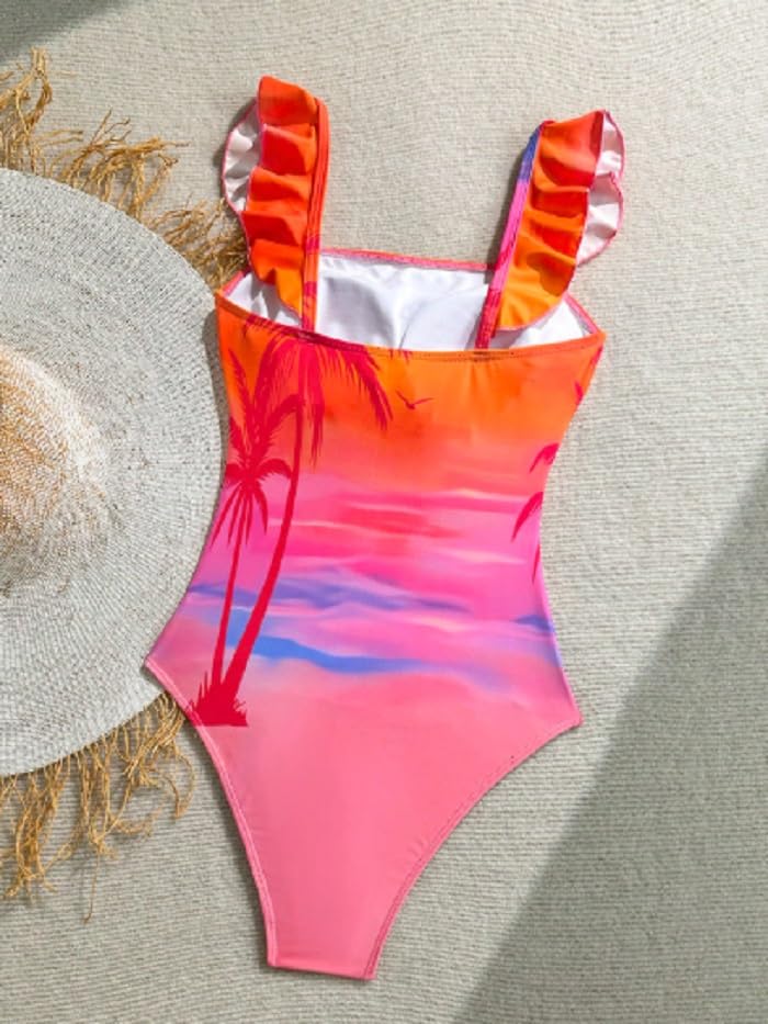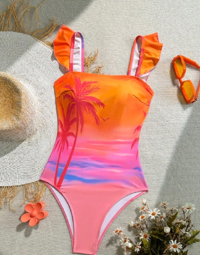 Generic - بدلة سباحة نسائية من قطعة واحدة بنمط غروب الشمس الاستوائي، أشرطة مكشكشة، طباعة شجرة نخيل برتقالية وزهرية