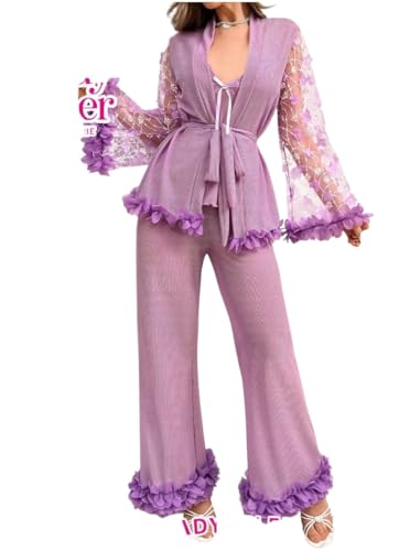 Generic - طقم حريمي قطعتين شيفون مطرز مع بنطلون واسع وان سايز