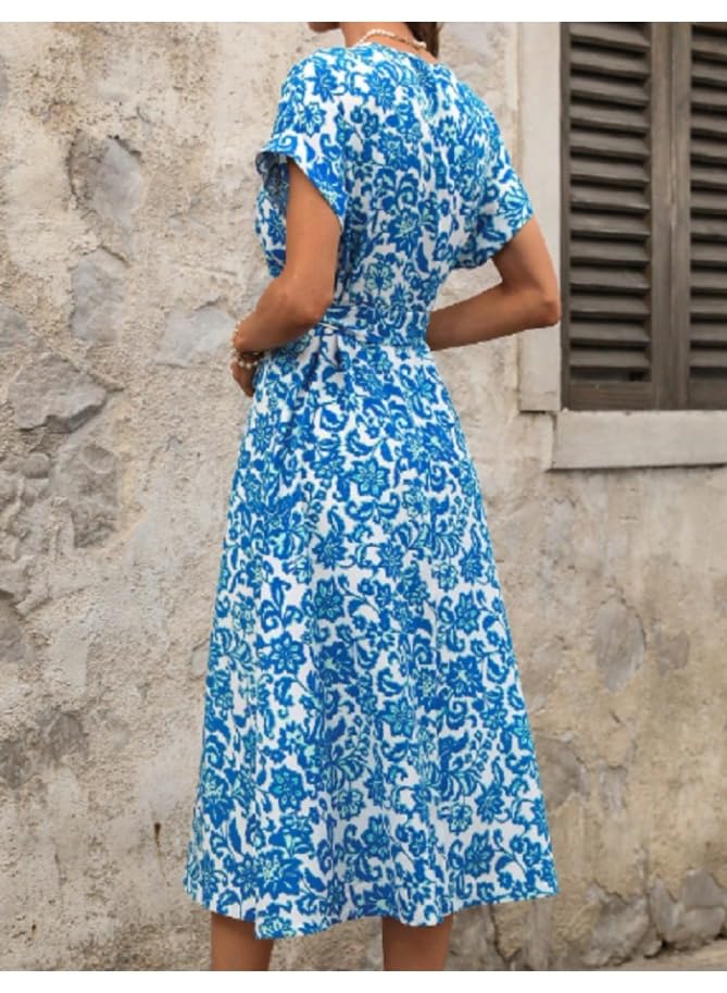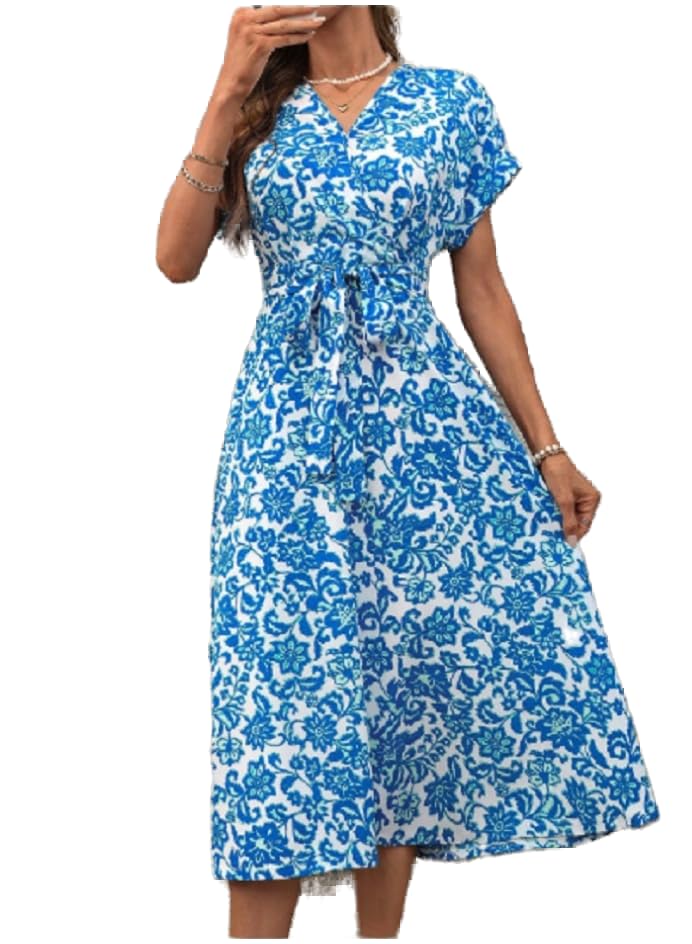 Generic - فستان ايه لاين بقبة V امامية متداخلة على الصدر وطبعة زهور واكمام رجلان مع رباط عند الخصر، مناسب لمختلف المناسبات، بما في ذلك اجازات الجزيرة والتنقل اليومي