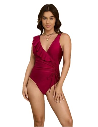 Generic - مايوه للنساء من قطعة واحدة بياقة على شكل V مزين بكشكشة وحبل شد جانبي بتصميم عالي المرونة، لون بورجندي