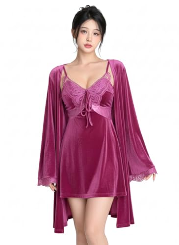 Generic - طقم ملابس نوم قطيفة كامي للنساء مع حافة دانتيل وروب، طقم ملابس نوم من 2 قطعة