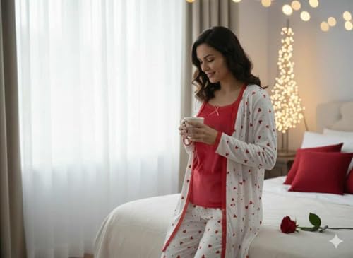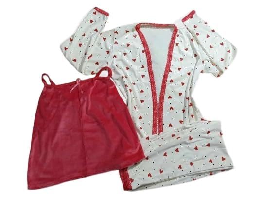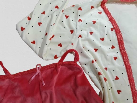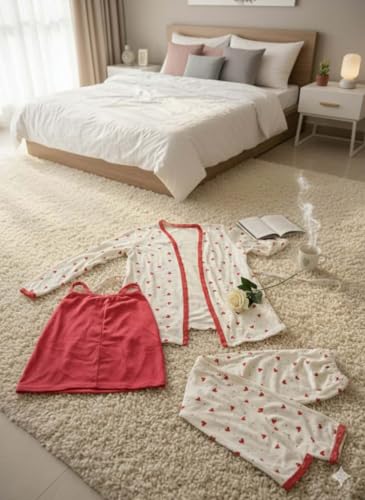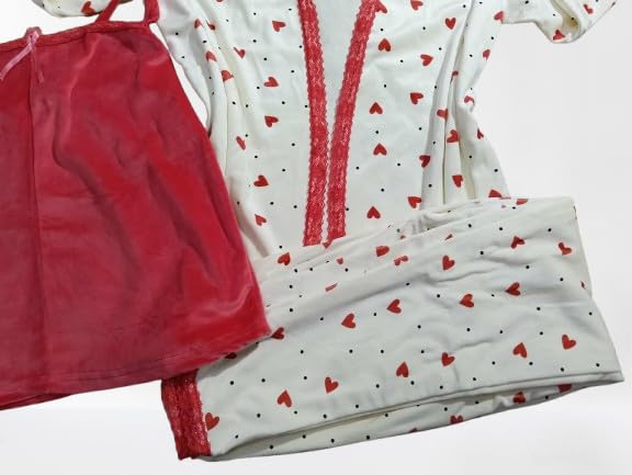 Generic - طقم بيجامة نسائية قطيفة، ٣ قطع، لون بطيخي غامق مع تطريز دانتيل، تصميم شيك مع ربطة قطيفة