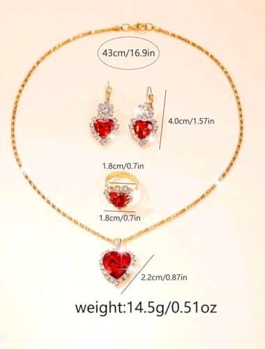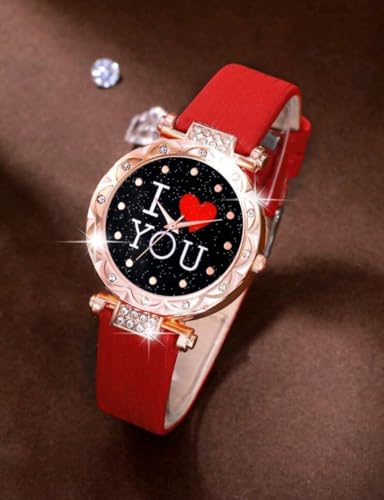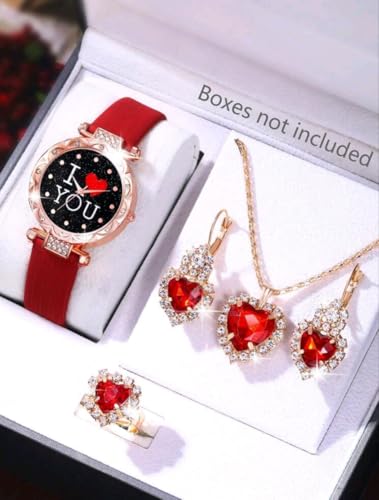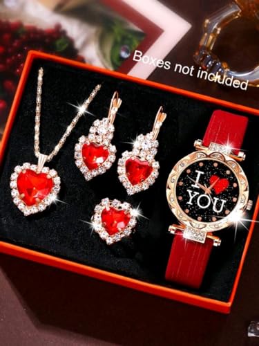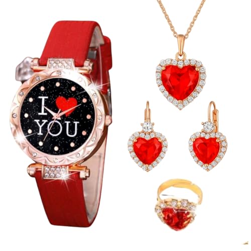Generic - طقم ساعة ومجوهرات نسائي – ساعة حمراء "I LOVE YOU" مع طقم قلب أحمر مرصع (عقد، حلق، خاتم) – تصميم رومانسي – مثالي للهدايا والمناسبات