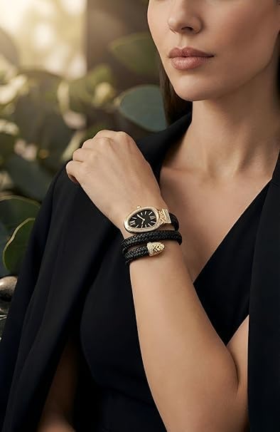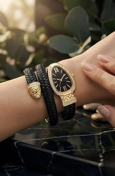 Generic - ساعة نسائية من الجلد مرصعة بالكريستال الماسي، حركة كوارتز، تصميم ثعبان، إكسسوار عصري