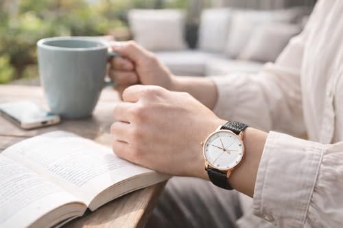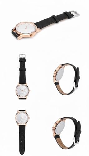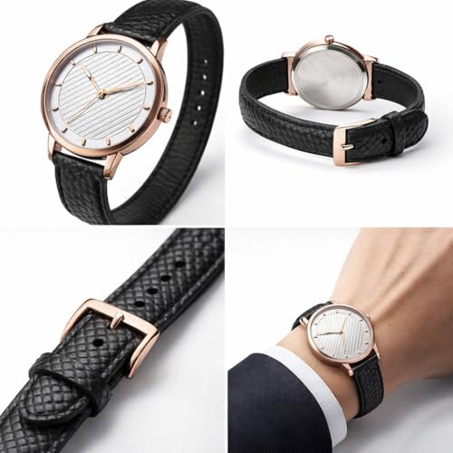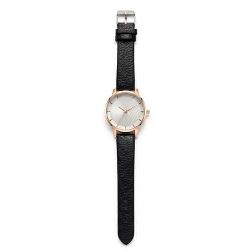 Generic - ساعة يد نسائية بسوار جلد أسود، هيكل ذهبي وردي، ميناء أبيض بتصميم خطوط