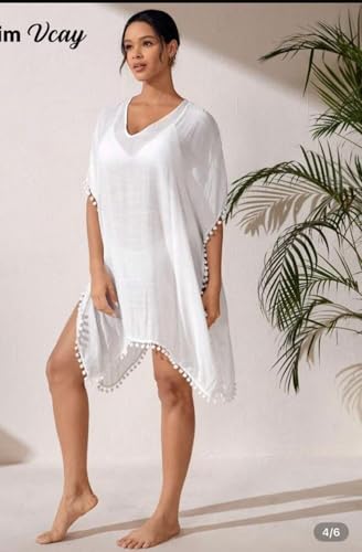 Generic - فستان نسائي ابيض للشاطئ مع حافة شراشيب، قبة على شكل حرف V، كم قصير