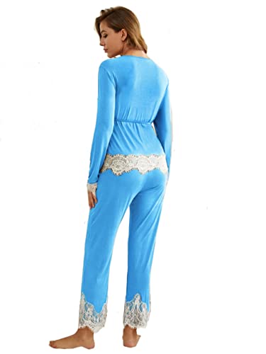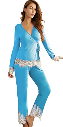 Generic - بيجامة نسائى أزرق سماوى قطن مزينة بجبير ابيض