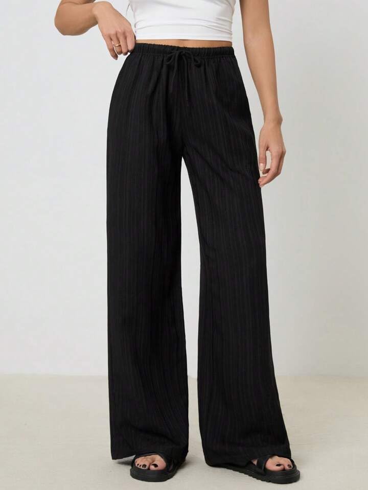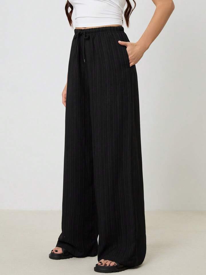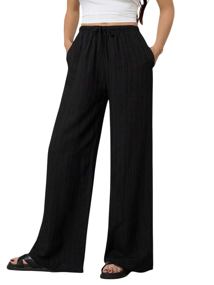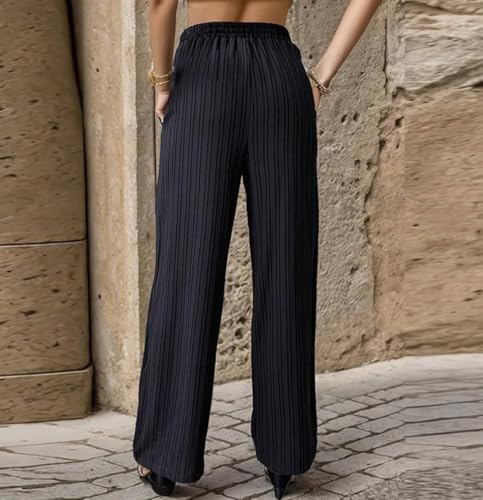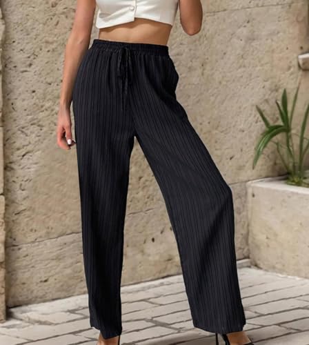 Generic - سروال مريح بارجل واسعة للنساء، خصر مرتفع، رباط، اسود، مقاس XL