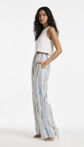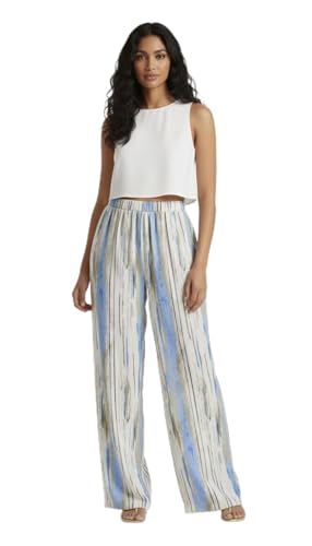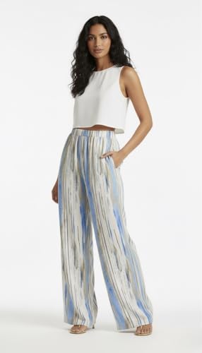 حت حور - سروال بالازو بارجل واسعة للنساء، قماش قطني ايطالي، طباعة الوان مائية تجريدية باللونين الازرق والابيض، حتى XL