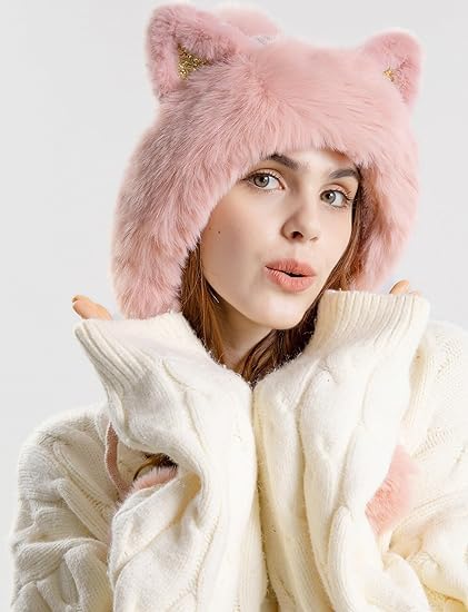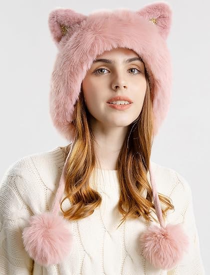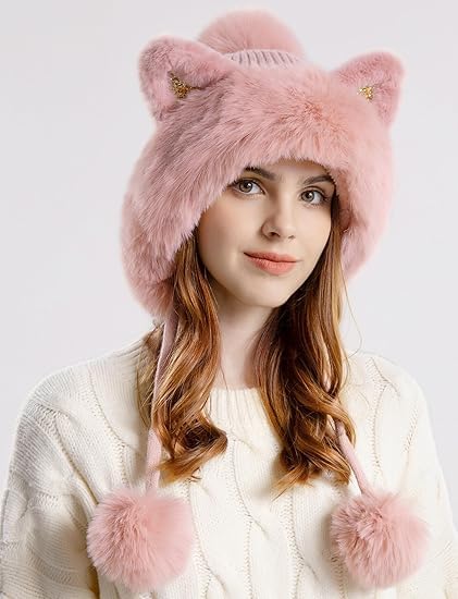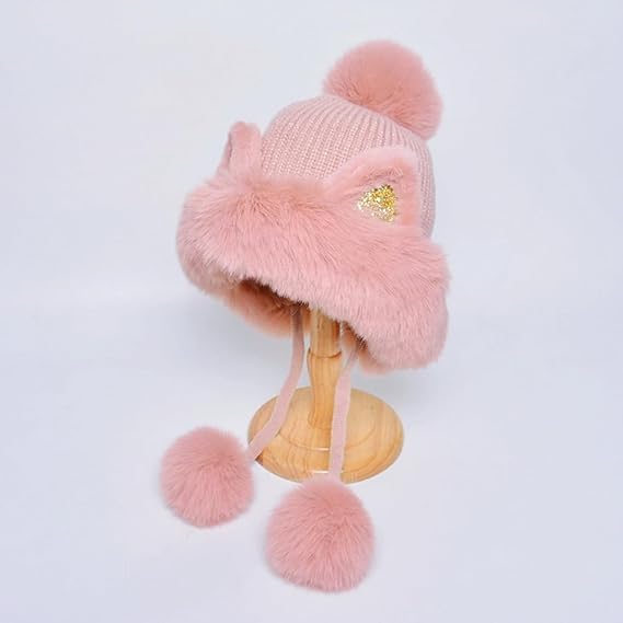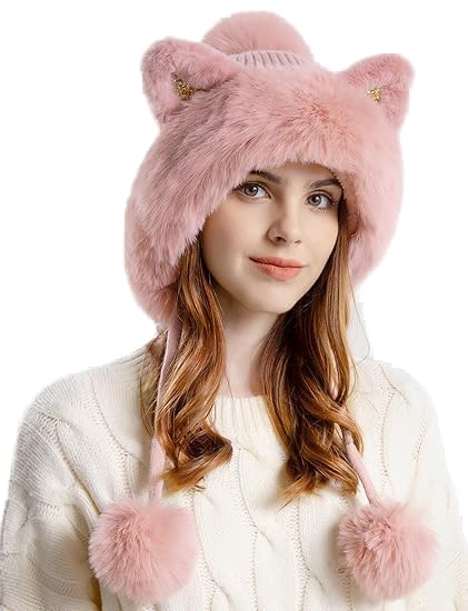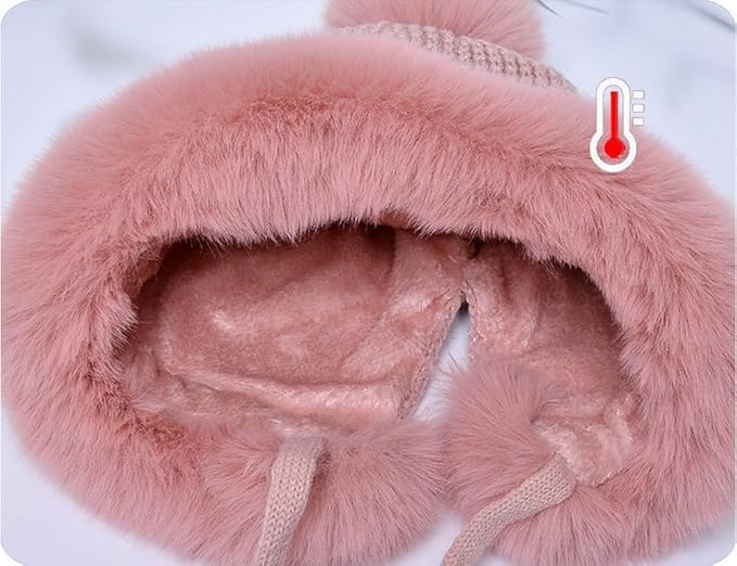 Parlberd - مجموعة قبعة صغيرة شتوية للنساء - قبعة منسوجة مبطنة بالصوف مع بالاكلافا ووشاح للرقبة، قبعة دافئة بتصميم جمجمة بوم بوم للطقس البارد، اغطية اذن مخملية من الفرو الصناعي (بينك)