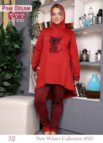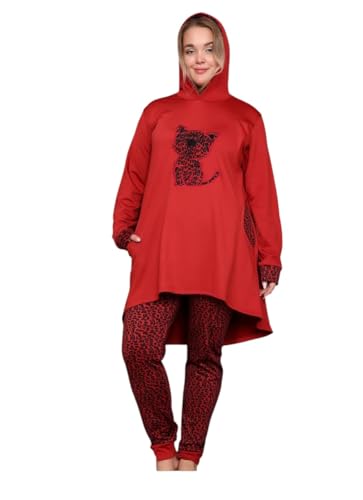 Generic - طقم بجامة نسائية شتوي قطن ميلتون، هودي طويل مع بنطلون، أزرق بطبعة قط، مقاس كبير
