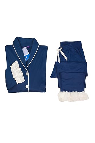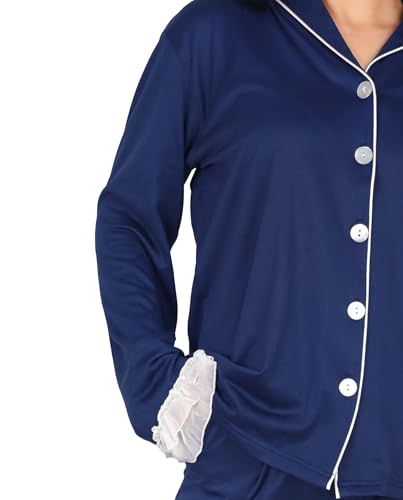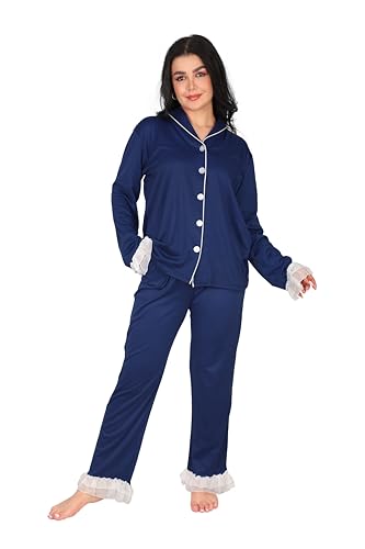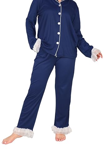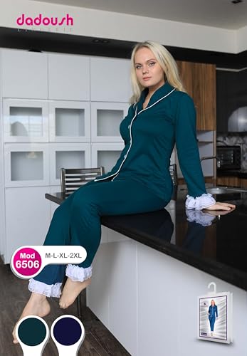 Dadoush - بيجامة قطن شتوية كلاسيكية مريحة للنساء للمنزل ، طقم بيجاما حريمي جاكيت وبنطال قطن، أزرار أمامية وكشكش دانتيل، متوفر باللون الكحلي والزيتي، مقاسات M-2XL