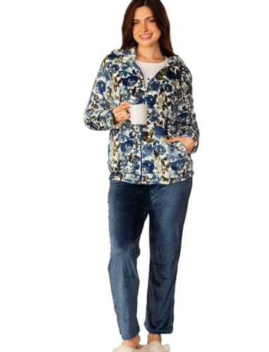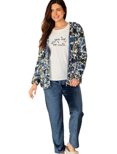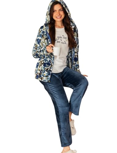 Generic - بيجامة شتوي تيشيرت أكمام بتصميم شعار و جاكيت كابتشو سوستة بتصميم زهور و بنطلون سادة للنساء