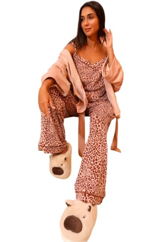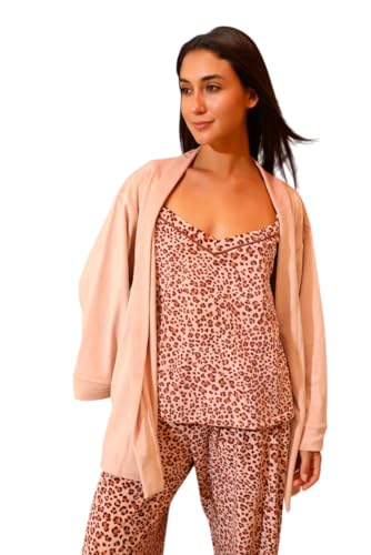 Generic - بيجامة شتوي قطيفة تيشيرت حمالات و بنطلون بنقشة تايجر و روب قصير بحزام للنساء