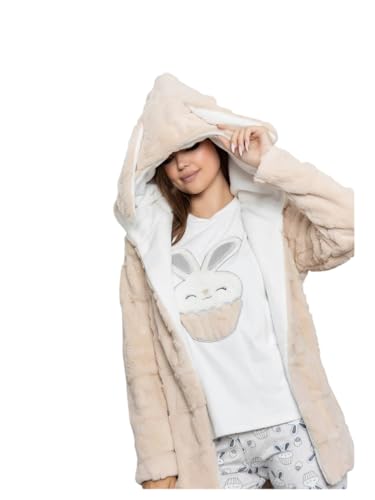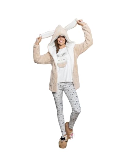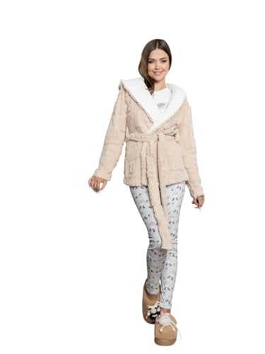 Generic - بيجامة شتوي قطيفة تيشيرت أكمام بتصميم شعار و جاكيت قصير بحزام سادة و بنطلون منقوش للنساء