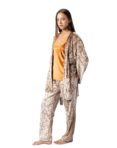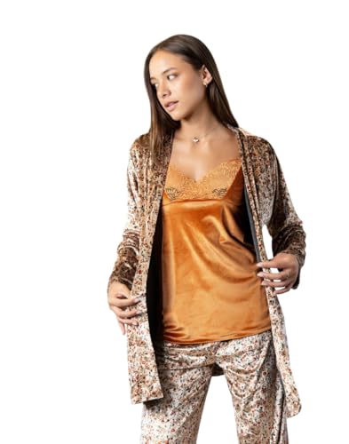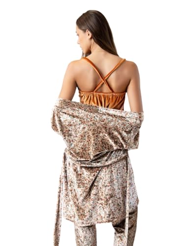Generic - بيجامة شتوي قطيفة توب حمالات مطعم بدانتيلا و روب قصير وبنطلون بنقشة زهور للنساء