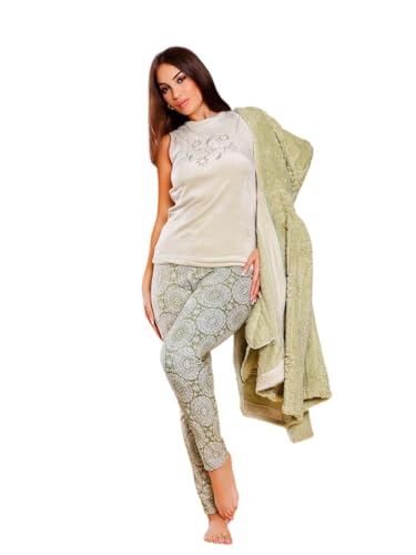 Generic - بيجامة شتوي قطيفة توب كات و روب قصير و بنطلون منقوش للنساء