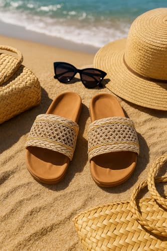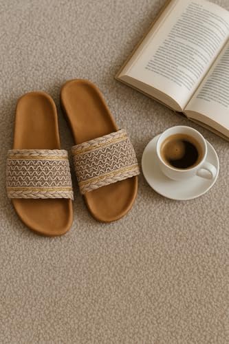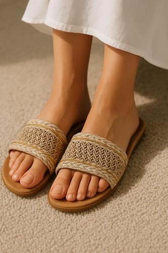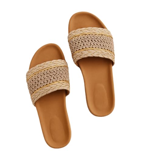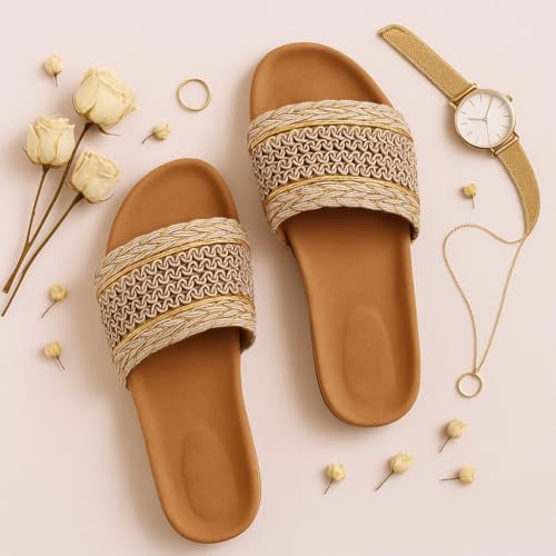 Generic - شبشب نسائي منسوج من القش بنمط مضفر مع لمسة ذهبية، نعل داخلي مريح بلون بيج غامق، مقاس 38
