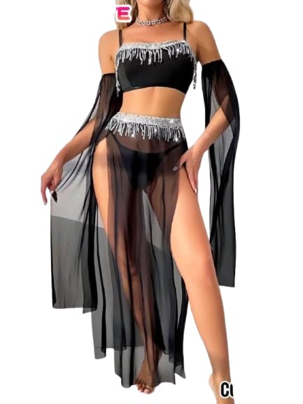 Generic - لانجيري شيفون قطعتين اسود مزين فضي مثير جدا للنساء والعرائس فري سايز