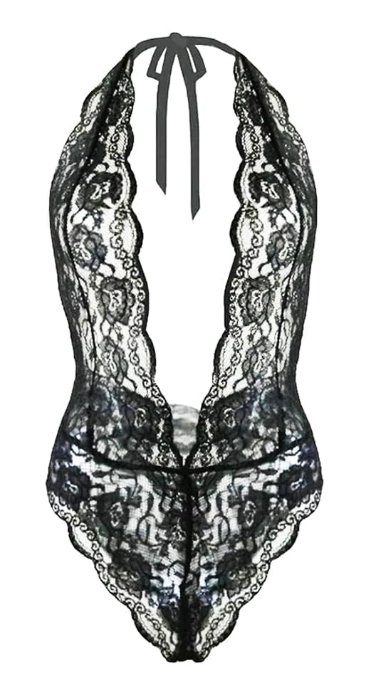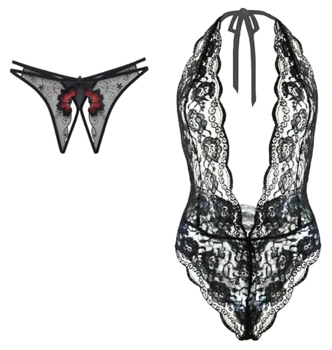 Generic - لانجيري سالوبيت تيدي برقبة على شكل حرف V هالتر للنساء دانتيل ناعم مثير أسود اللون مستورد + بانتي إثارة مستورد أسود مطرز زهرة دانتيل ناعم ((هدية مجانية))