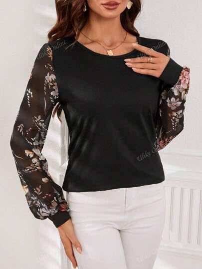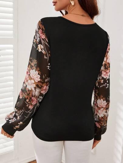 Generic - توب كاجوال يومي بسيط بلون سادة وكم مطبوع للنساء، للربيع/الصيف