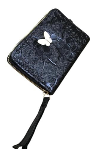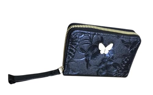Generic - محفظة نسائية صغيرة بسوستة مع جيوب داخلية، تصميم منقوش بزخارف الفراشات والأزهار، عصرية مع حزام معصم (اسود)