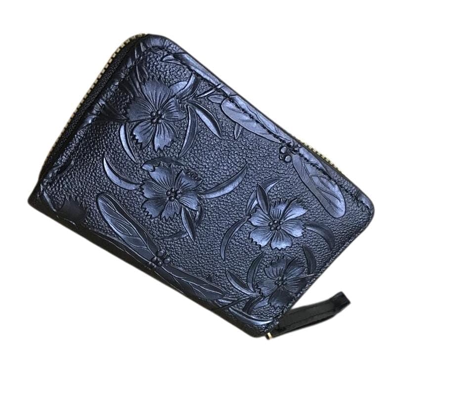 - تصميم فني راقي: محفظة نسائية بلون أزرق سماوي مزينة بنقوش بارزة لفراشات وأزهار وأوراق نباتية ثلاثية الأبعاد مع زينة فراشة معدنية أنيقة