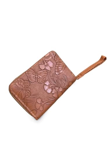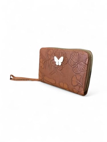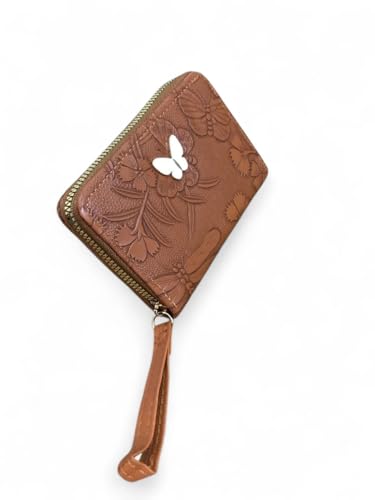 Generic - محفظة نسائية صغيرة بسوستة مع جيوب داخلية، تصميم منقوش بزخارف الفراشات والأزهار، عصرية مع حزام معصم (بني)