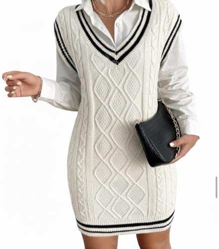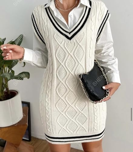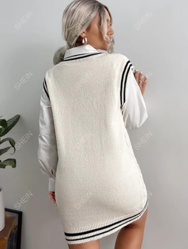 Generic - فستان سويتر محبوك برقبة على شكل حرف V بدون اكمام للنساء، بيج مع حواف مخططة سوداء، مقاس XL