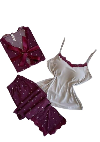 Generic - بيجامة صيفي كاجوال للنساء 3قطع مقاس موحد قطن كود 7551 لون نبيتي