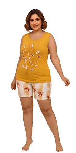 Generic - طقم بيجامة نسائية صيفية، قطعتين، قميص بدون أكمام أصفر مزين بالورود مع شورت أبيض، مقاس كبير