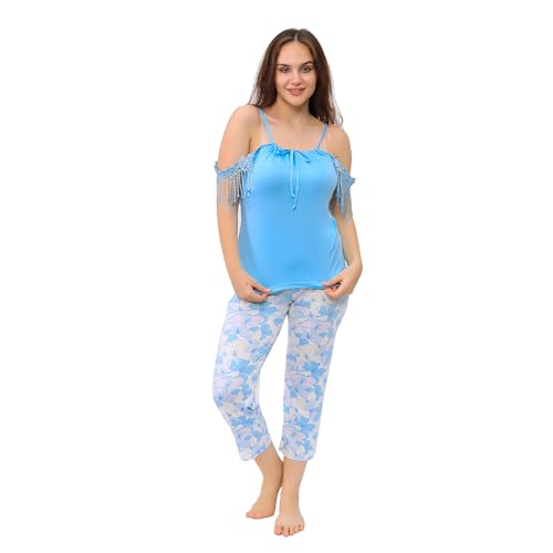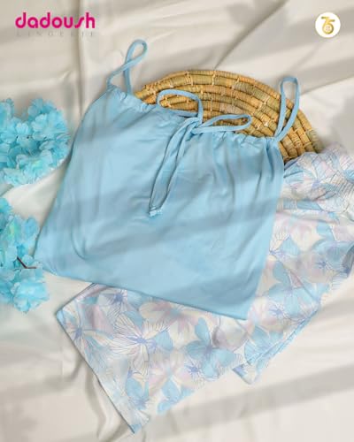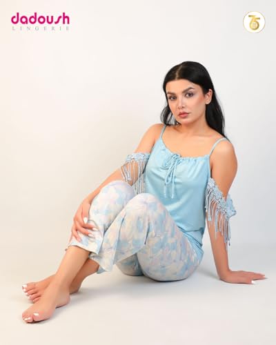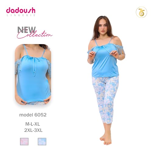 Dadoush - طقم بيجامة نسائية صيفية، قميص أزرق بحمالات وكشكش، بنطلون كابري بنقشة زهور، بيجامة كلاسيكية للنساء، طقم ملابس نوم ناعمة - بيجاما صيفي حريمي بنتكور - طقم بيجامه حريمي كاجوال