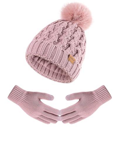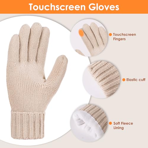 QAQMVM - طقم قبعة صغيرة شتوية وسكارف وجوانتي وقبعة بوم مع سكارف طويل محبوك مبطن بالصوف الدافئ وجوانتيات تعمل باللمس للطقس البارد
