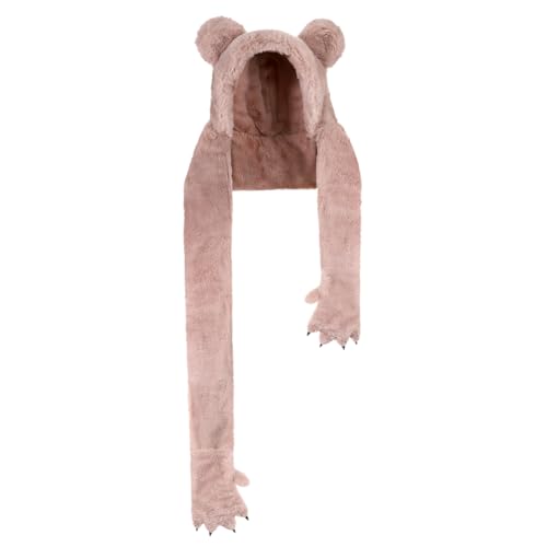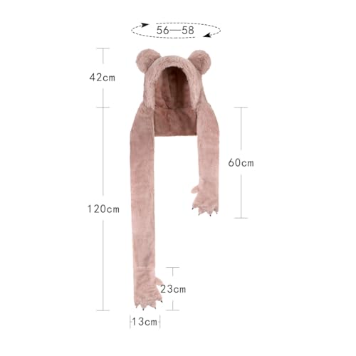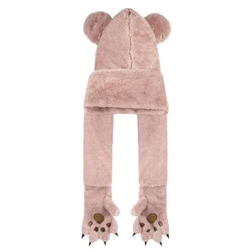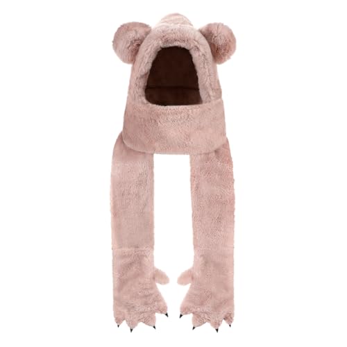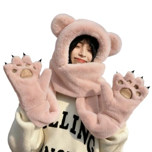 XINCHIA - قبعة شتوية 3 في 1 بغطاء راس ودب لطيف منفوش للنساء مع قفازات وقفازات بتصميم كرتوني زغبي وجمجمة وحيوانات للتزلج ووشاح طويل وشال وقفازات حرارية لتدفئة الرقبة في الطقس البارد