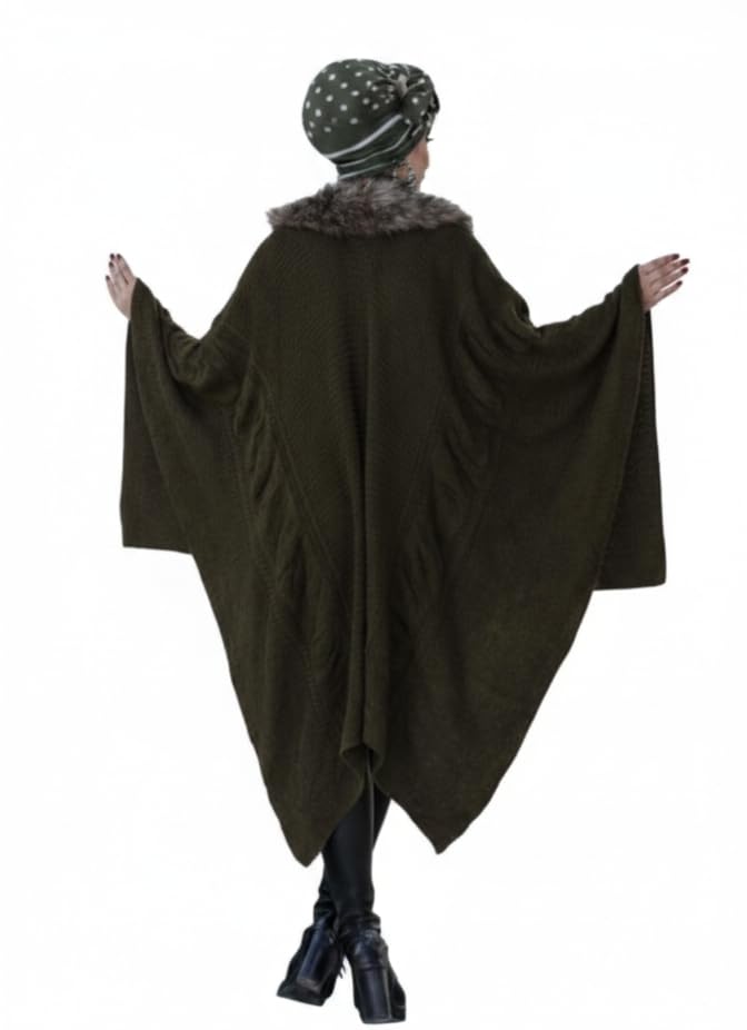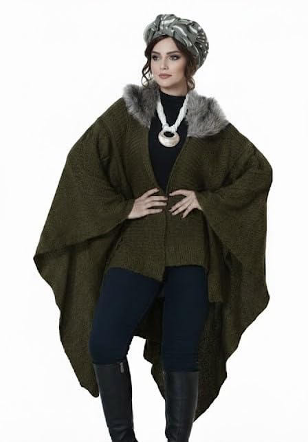Generic - شال حريمي شتوي مع ياقة فرو ، بونشو شتوي ، كارديجان حريمي ، كاب شتوي تريكو صوف .
