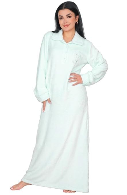 Dadoush - قميص نوم حريمي فرو طويل، بياقة وأزرار - عباية نسائية شتوية فاخرة من الفرو الناعم، تصميم طويل أنيق - ثوب نسائي طويل بأكمام طويلة (سماوي, XL)
