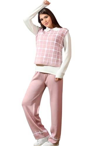 Generic - طقم رياضي نسائي بياقة قميص، تصميم كاروهات، بلوفر وبنطلون واسع، ألوان متعددة