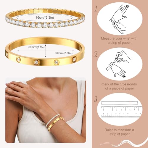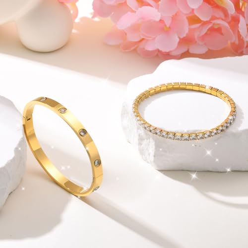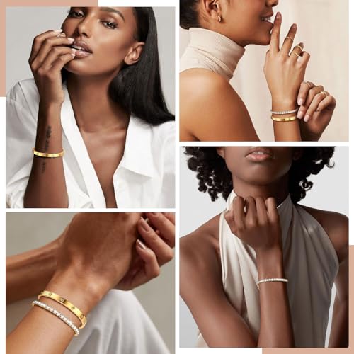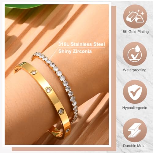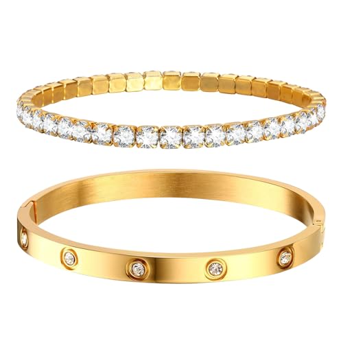 generic - اساور ذهبية قابلة للتكديس للنساء - اساور حلقية للصداقة والحب مطلية بالذهب عيار 18 قيراط غير قابلة للبهتان، مجموعة اساور تنس من الزركونيا المكعب، هدية للكريسماس وعيد الحب وعيد الميلاد للنساء والفتيات