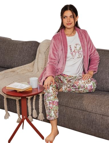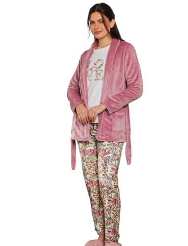 Generic - بيجامة شتوي قطيفة تيشيرت أكمام بتصميم شعار و جاكيت بجيوب قصير سادة و بنطلون بنقشة زهور للنساء