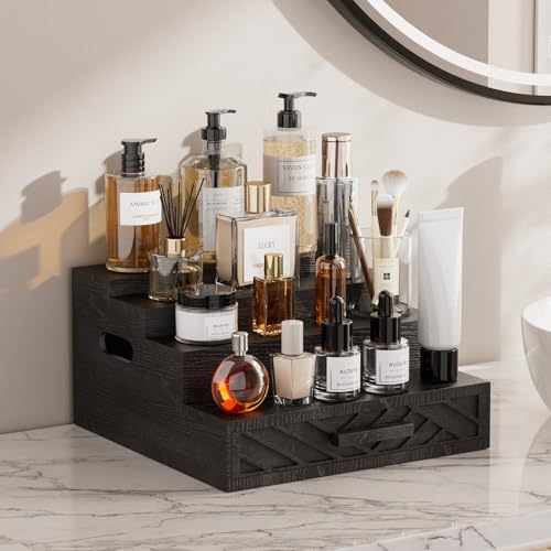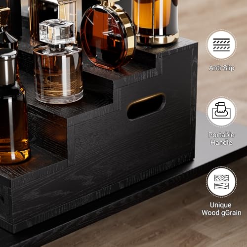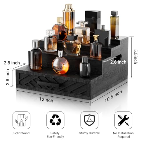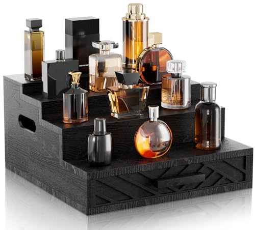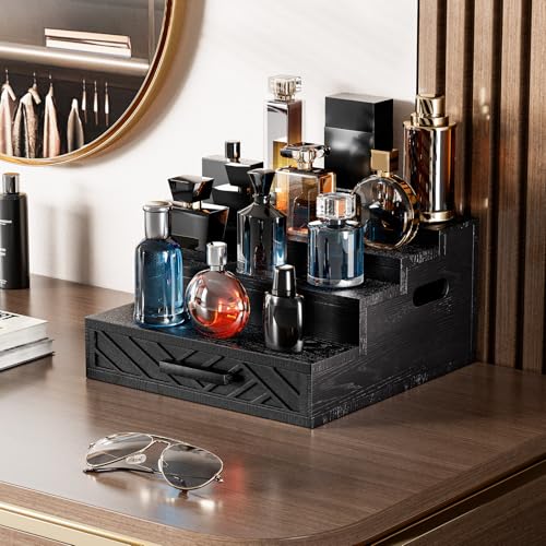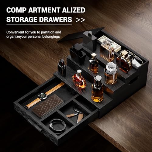 Vecxoty - منظم كولونيا خشبي للرجال، حامل كولونيا أسود 30.48 سم مع درج ومساحة تخزين مخفية، منظم العطور لخزانة الملابس، حامل عرض خشبي لمكياج العطور والمجسمات، للرجال