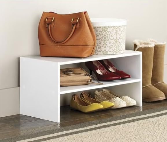 • رف أحذية خشبي قابل للتكديس، لون أبيض.