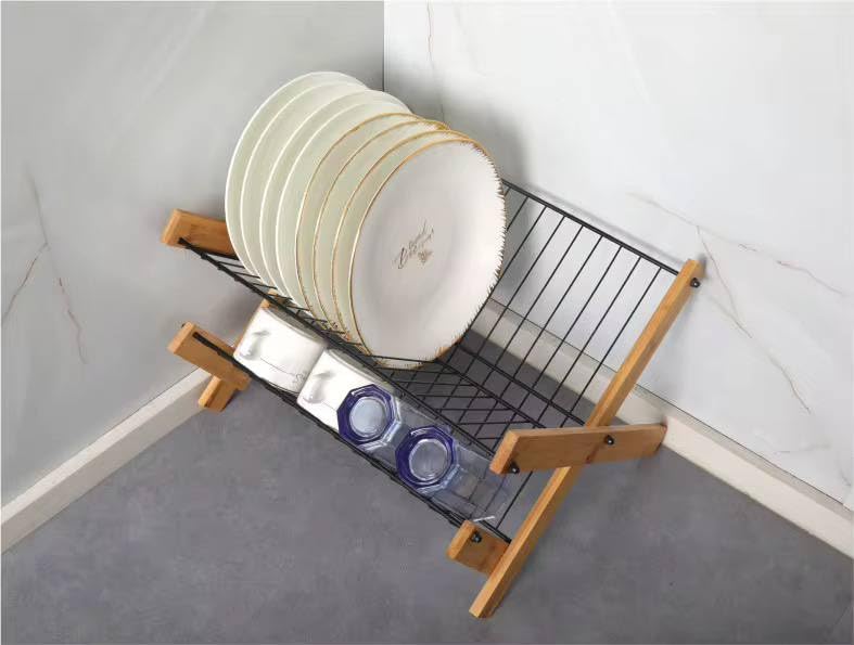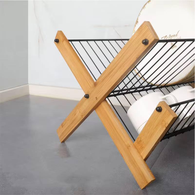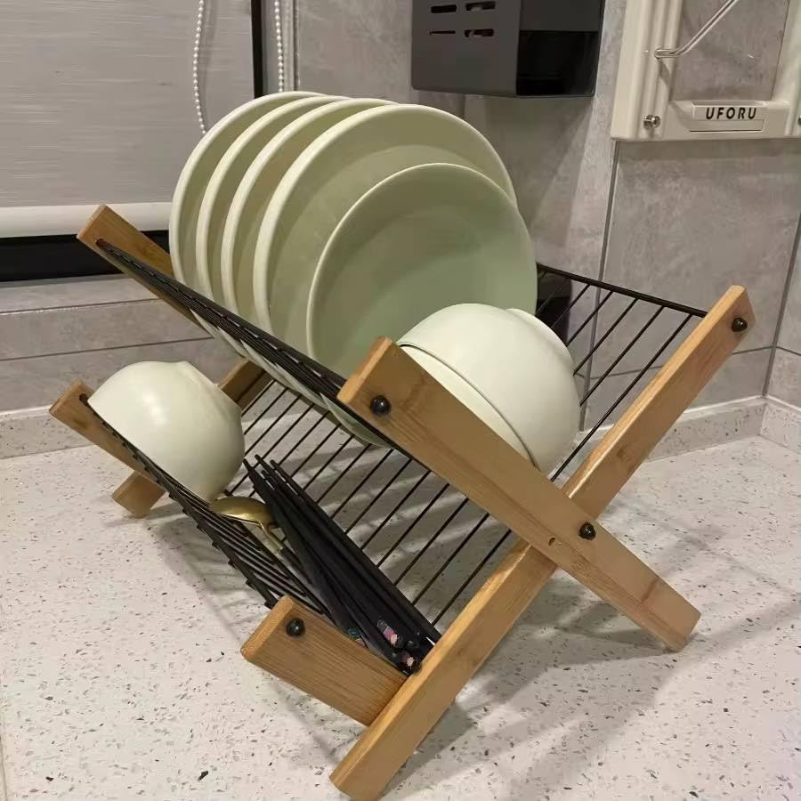 Generic - رف تجفيف أطباق من الخشب والمعدن، طبقتين، تصميم قابل للطي، حامل أطباق وأكواب للمطبخ