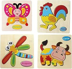 - لعبة أحجية جذابة: تتضمن مجموعة الأحجيات هذه أربع قطع خشبية ملونة بتصاميم حيوانات جذابة، فراشة ودجاجة ويعسوب وبقرة.